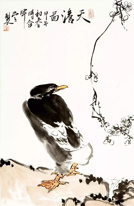 中国古代花鸟画与人物画、山水画,并列为中国绘画的三大画科。花鸟画是一个晚熟的画科,它经历了较为漫长的历史积累过程。自唐始,花鸟画才成为一个独立的画科,经五代、宋代的大发展时期,而渐趋成熟。然而,以水墨写意花鸟画为主要艺术表现特征和审美追求,则是花鸟画走向发展高峰期的标志,这是在明、清以及近、现代的事。明徐渭,清八大山人、吴昌硕,近、现代齐白石、潘天寿、李苦禅等诸大家为其主要代表人物。 一个画科的形成、发展并走向成熟,它的内在成因极为复杂。不可否认,它与中国独特的文化背景和人文精神有着密切的机缘关系。写意花鸟画的出现,丰富了中国绘画的科目,开启了艺术表达的新“语境”,并充实了传统人物画、山水画难以尽意表达的艺术内涵,创造出了追求本体性的“格调”艺术。它融合了用笔、用墨、用色、造型、章法等绘画技巧手段,在“写”的艺术表达中,将花鸟画推向了抒怀畅神的尽情写意中。今天看来,这种艺术的高超与美妙之处,在于它文化的涵融性、技巧的超然性,是艺术家的自我性灵与真趣完美契合的全面体现。可以说,中国写意花鸟画艺术所显露的不是表象的题材(物)与无生命“意味”的艺术符号(形式),而是文化精神、艺术品格与心象、视觉的完美综合体:由对客观自然的描绘,而进入内心的省悟;由小生命观其大宇宙,追求朗达、简远的审美情思。它充满了人文情怀的艺术表达,折射出人格的精神取向。这一艺术品格的建构不仅谱写了写意花鸟画的辉煌历史,而且,营造了博大的艺术创造天地,为今天的艺术探索提供了更多的发思求变的途径。