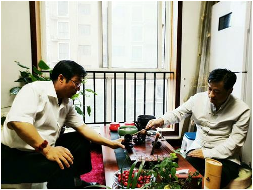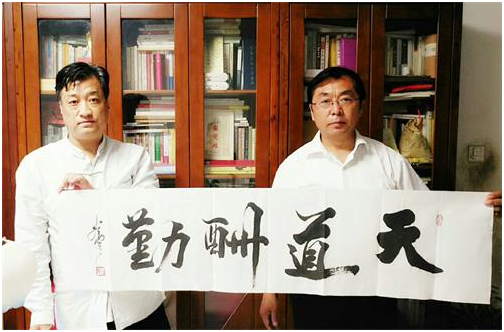 作家王新为作家姚展雄敬赠《天道酬勤》作品时留影 两位作家在交流中话题始终不曾离开文学创作以及笔墨修行的探讨,交流期间,王新先生为姚展雄先生敬呈了《天道酬勤》的书法作品,姚展雄先生以《画禅》相赠王新先生,彰显了文人之间君子淡雅之交,王新先生和姚展雄先生同时表示,以后会加强彼此间的联络,以文会友、共同学习、繁荣文学艺术的创作。