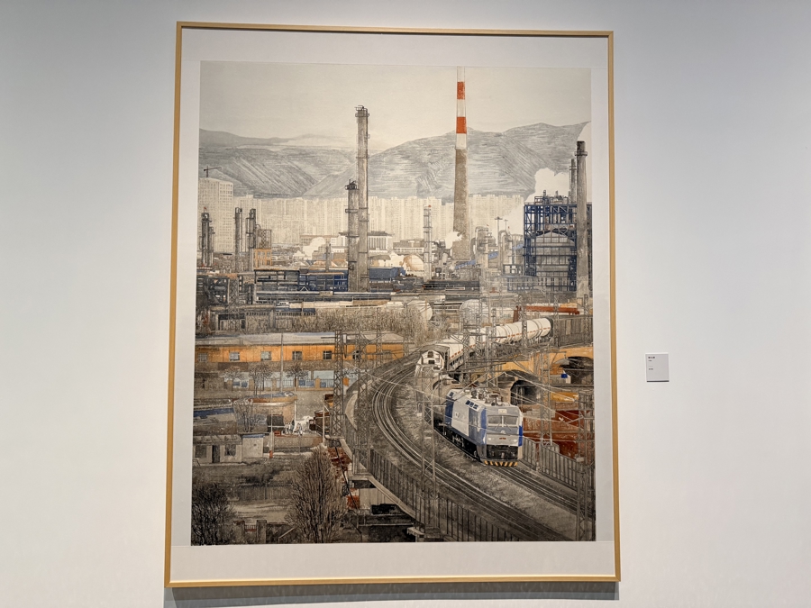 吴争真此次凭借中国画《复兴之路》获奖,作品呈现了工厂、铁轨、火车等人们熟悉的景象。她介绍,灵感来源是母校华东师范大学附近常见的货运火车,“我经常看到很高很大的火车从铁轨上驶过,让我想到之前看的一些影视剧,也会展现火车和我们发展的关系,这其实就是我们的‘来时路’。” 吴争真的中国画作品《复兴之路》,获“白玉兰美术奖”优秀奖。李昂 摄