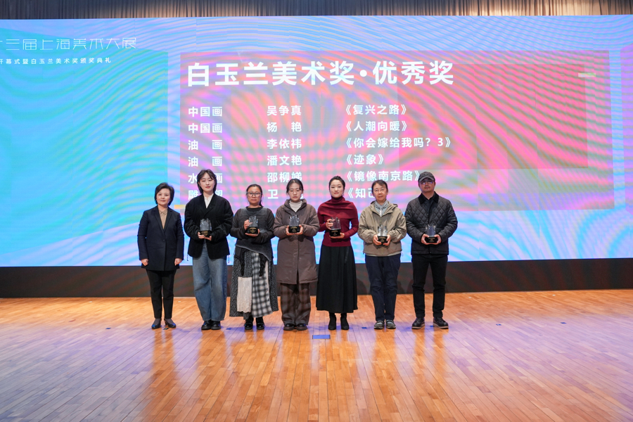 最年轻00后创作者连续两届获奖 “上海美协一直在为这座城市的艺术生态搭建高水准的平台,也为我们青年作者创造出越来越多被看到的机会。协会对青年一代真心实意的栽培和托举,就像一股持续而温暖的力量,让我们这些还在起步阶段的创作者,有勇气一次次地拿出作品,站到更大的舞台上接受检验。”获本届“白玉兰美术奖”优秀奖的吴争真说。2002年出生的她,继第十二届上海美术大展获奖后再次斩获奖项,也是本届获奖作者中最年轻的一位。 获本届“白玉兰美术奖”优秀奖作者合照。