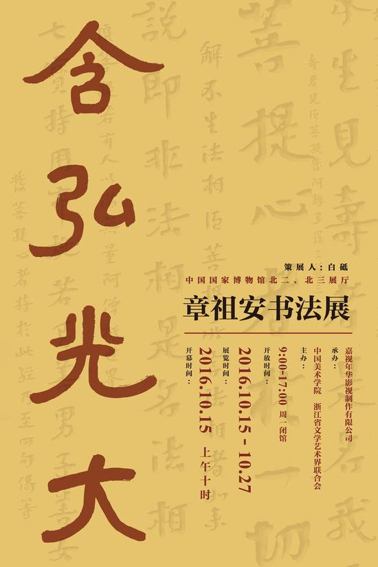 中国书画导航网消息(通讯员:景亮)2016年10月15日上午10时,“含弘光大——章祖安书法展”在北京中国国家博物馆开幕。 本次展览由中国美术学院、浙江省文学艺术界联合会联合主办。章祖安先生系中国美术学院教授,从1963年起,参与浙江美术学院全国首届书法篆刻本科班的教学工作;1979年任全国首届书...[详细内容]