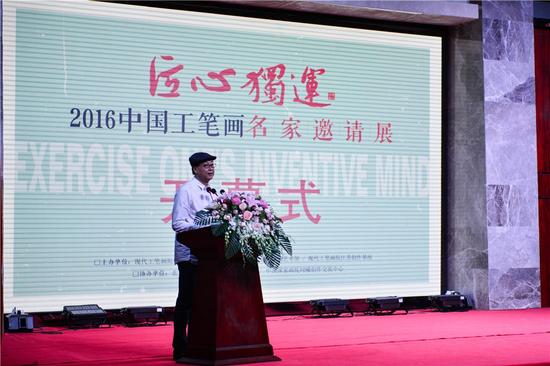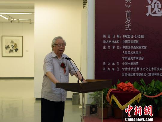 《天马腾云·戈翁写逸》丁二兵书画展23日在北京中国国家画院美术馆开幕。图为中国美术家协会中国画艺委会秘书长孙克在开幕式上致辞。 张晓曦 摄 中新网北京6月23日电 (张晓曦 黄靖羲)由中国国家画院美术馆、人民美术出版社、甘肃省美术家协会主办的《天马腾云·戈翁写逸》丁二兵书画展23日在北京中...[详细内容]