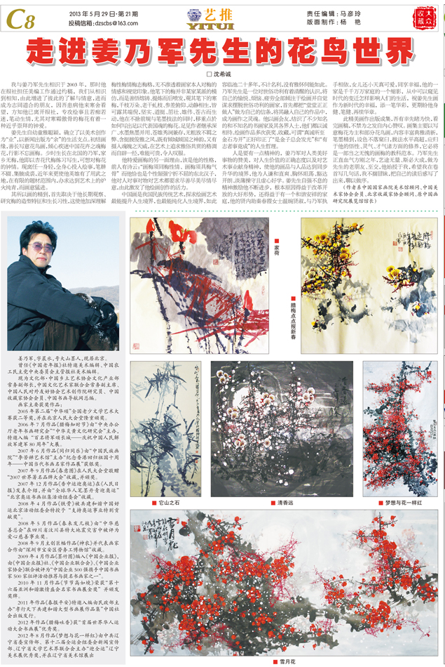 大众收藏报5月29日专版刊发走进画家姜乃军先生的花鸟...