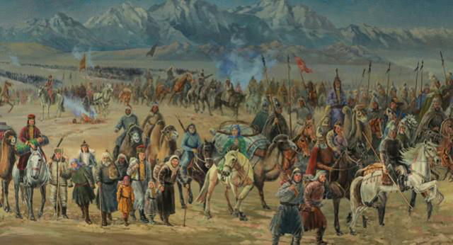 和静县本土画家林岱新作《回归祖国》骑着战马的渥巴锡遥望东方,他身边的将士们眼里,和他一样透着回归祖国的坚定,成千上万的妇孺和老人乘着马车,骑着骆驼,赶着牲畜,拉着雪撬,一队接一队地迤逦前行,身后是沙俄军队的围追堵截,硝烟四起……几百个人物、几百种表情栩栩如生。这幅长17.71米、宽2.4...[详细内容]
