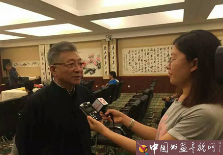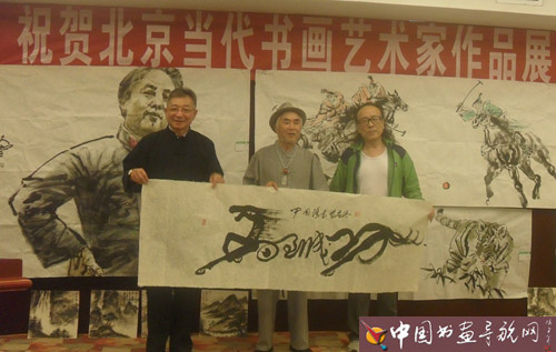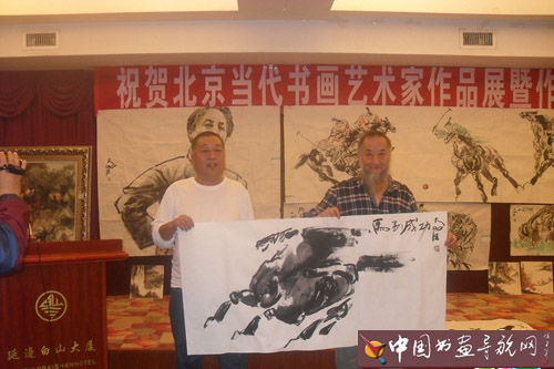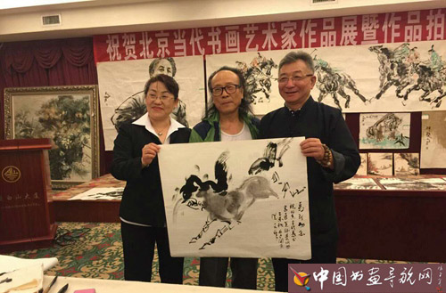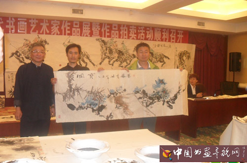 延边国画院长田成义将画作赠给本次活动的组织者(左起:石洁、田成义、黄晓军) 阎大智现场创作的画作被一位书画爱好者收藏