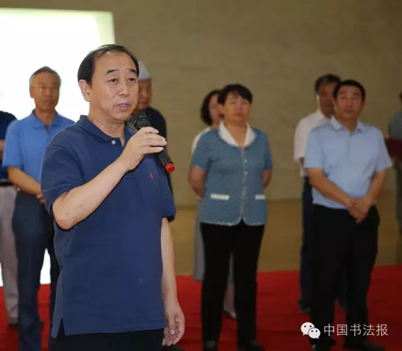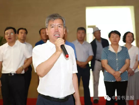 李世俊致辞  周凤臻致答谢词  蔡猛、苏不达其其格双语主持 郝秀川在致辞时表示,周凤臻作为锡林郭勒盟土生土长的书法家,长期坚持研习书法,乐在其中,并逐步形成自己独特的风格。他的书法运笔娴熟、结体秀美、布局洒脱、意味空远。擅长行草,灵动中不失大气;长于榜书,厚实中更显从容与老辣。这正体现了他的秉性、为人及其艺术上的悟性。常年手不释卷的读书底蕴,再加上锡林郭勒广袤草原、灿烂文化、淳朴民风等人文环境的滋养,呈现出一幅幅多姿多彩的精品力作。 李世俊在致辞中表示,周凤臻先生的书法作品刚柔并济,有晋唐之韵、明清之风。他学识渊博,其作品上呈现出一种厚重的文化底蕴。“笔墨精良人生乐事,气质变化学问深时。”他的作品上流露出了他对书法艺术的追求与理解,还体现着他知识的积累。正如吴丈蜀先生说的“踏破藩篱觅旧踪,师承汉魏善融通。成家岂是临摹得,造诣全凭字外功。” 周凤臻致答谢词时首先对到场的领导、嘉宾以及家人、朋友表示感谢。他自谦道“献‘丑’也是一种美德”。他表示要写好字,首先要做好人,要很好的读书,要很好的学习。写字是他发自内心的爱好,并将继续在书法的道路上探索下去。锡林郭勒草原雄浑、博大、宽阔、直率、坦荡,这些美的品质给了他充分的滋养。