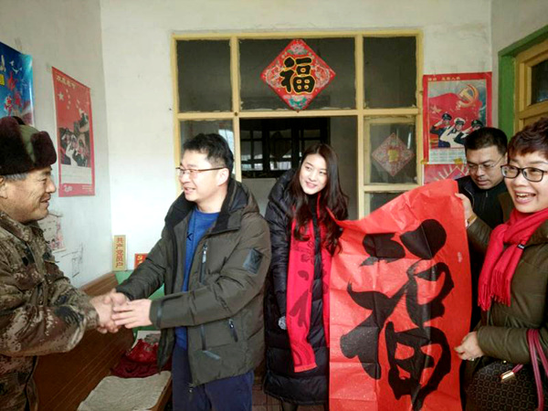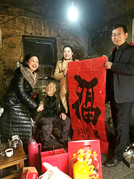 送“福”到家 在军属王守考、崔友英夫妇家,慰问小组送去了代表祝愿的大红“福”字,祝愿老人身体健康!这两位老人的儿子在青岛执行巡航任务时牺牲。
