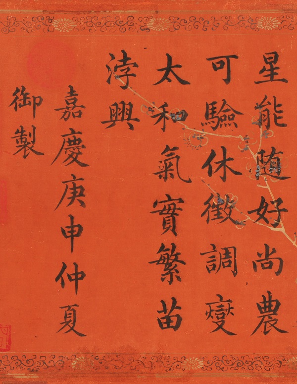 清赵秉冲《楷书手卷》 乾隆瓷器中,展出的唐英督陶洋彩瓷笔筒与壁瓶两件,为乾隆六年之后的“唐窑”精品。洋彩、珐琅彩呈色、彩绘技法均高度纯熟。如“清乾隆御制洋彩胭脂红地轧道莲花蝠纹开光御题诗壁瓶”即为一代表。璧瓶腹部由四只展翅蝙蝠构成长方开光,蝙蝠施彩立体,橙、黄、蓝、粉交错,具有珐琅彩料绘制风格。蝠翅绵延宽广,前所未见,象征福泽深厚。内施白釉,其上墨彩篆书御制诗,“一瓣名香静里焚,篆烟缕缕白如云。幽情未许旁人㑹,手自翻书到夕曛。” 并“干”、“隆”二字方章。此篆文形如柳叶,但更为准确地讲,应是以小篆字形,结合《说文》中古籀的用笔。御制诗名“夏兴三十首”(载于《御制乐善堂全集定本·卷三十》),是弘历为皇子之宝亲王时期作品。诗中细腻地描绘了一幅夏日青年弘历于宫中品香的优雅情致。开光外作胭脂红地锦上添花纹饰,颈部出双耳。