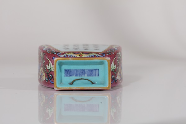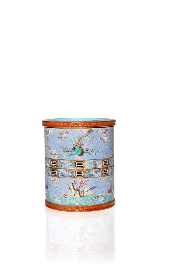 清乾隆御制洋彩胭脂红地轧道莲花蝠纹开光御题诗壁瓶 古人所用之物,皆附以美好寓意,清宫帝王之物更是言必有意,意必吉祥。另一件“清乾隆御制洋彩‘江山一统’八卦玲珑旋转笔筒”为直筒型,制作工艺精巧,口、足边出,环壁形足。内施松石绿釉。筒身以天蓝色地绘蓝彩卷草纹成锦地,筒身上壁可旋转,绘以洋彩五色凤、凰二禽,并遍布祥云纹。腹部中央为上下两周小长方形开光,饰“万字不到头”以喻万寿无疆,并于描金开光内以墨彩书八卦卦象。筒身下半部绘龙马负图、灵龟两只、及六岳山石及海浪灵芝。外口、足边饰红彩描金纹饰。底施松石绿釉,落青花篆书“大清乾隆年制”款。此件笔筒转心之处饰以太极八卦纹样,上下交泰以示天地,旋转器身,将之组合为上干下干六个阳爻的干卦,是为笔筒首要主题图案。据悉,因成品率极低,存世稀少,为公私收藏存世仅见的两件江河一统笔筒之一。