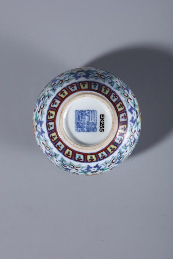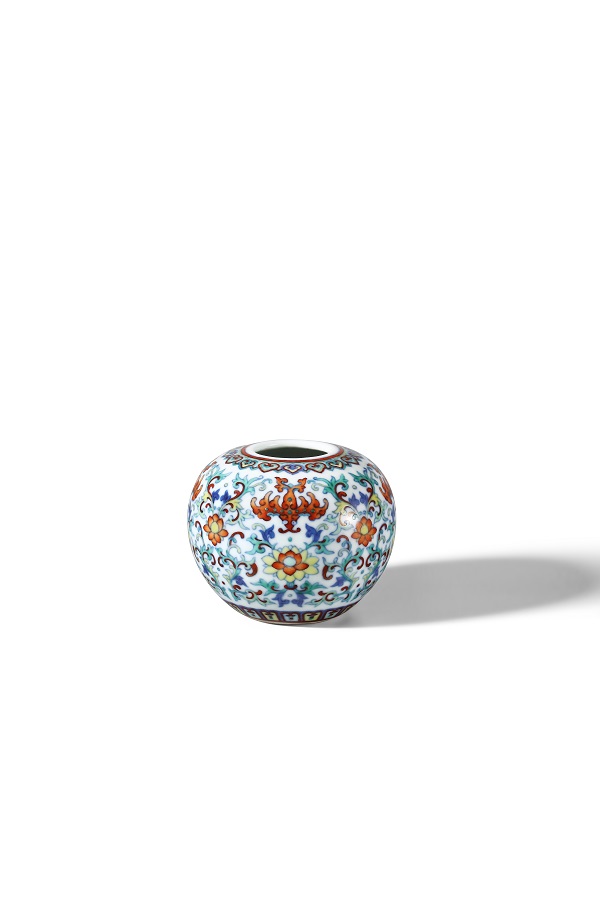 清乾隆御制洋彩八卦“江山一统”转心笔筒 “清乾隆斗彩瑞莲福至心灵水盂”,水盂平口,丰肩,圆腹,束底。器体浑圆,通体施白釉,外壁斗彩绘缠枝莲纹搭配蝠纹为主题,先以青花绘整体纹饰,再于青花轮廓内填绘红、黄、绿、紫等色彩。口沿及圈足处装饰精致的如意云头纹与变形莲瓣纹,肩部绘四只矾红蝙蝠被盛开的佛莲围绕,寓意“富贵吉祥”、“福至心灵”内壁及底施白釉,底青花书“大清乾隆年制”双行六字楷书款。此类特殊品种,即为御贡瓷器,由九江关监督在御窑厂精心烧造专门供乾隆皇帝御用的器皿,其数量少,质量精,纹饰和造型均不同于大运瓷器,一年三贡,分别于端阳节,万寿节和年节这三个节日前进宫供御。