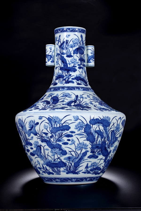 清乾隆斗彩瑞莲福至心灵水盂 “清乾隆青花莲池清趣图折肩贯耳壶”,此件体量硕大,直口,长颈,颈两侧对称饰贴竖直管状耳,折肩,肩下渐收,圈足,造型稳重古朴。口沿、颈下方、近底足处各绘带状海水纹一周。双耳之上各绘荷花一组。颈部、肩部、腹部满绘高低错落的荷花、荷叶,纹饰繁复有序,清新而不媚俗,雅致且尊贵。底施白釉,正中落“大清乾隆年制”六字三行篆书款。