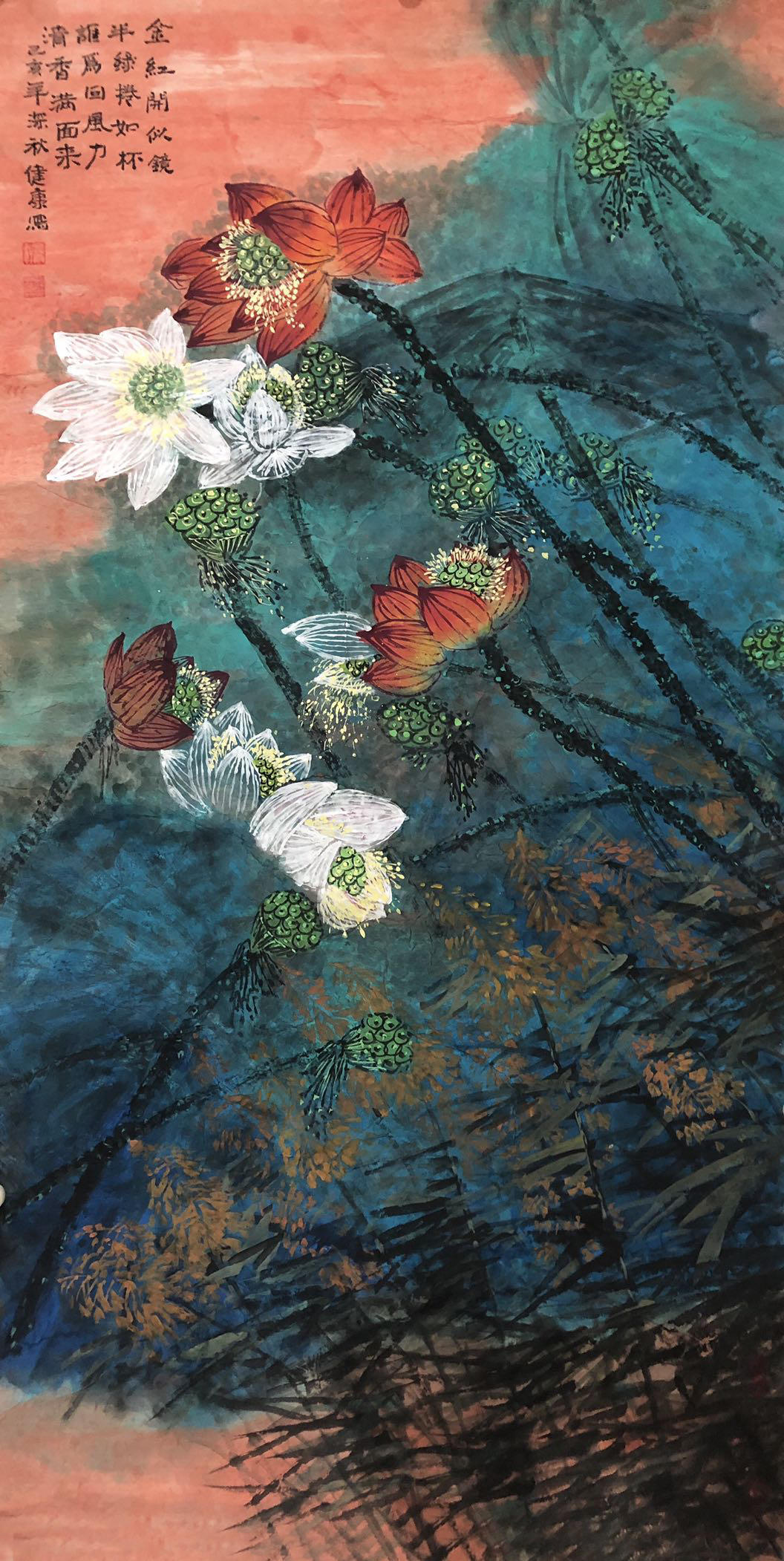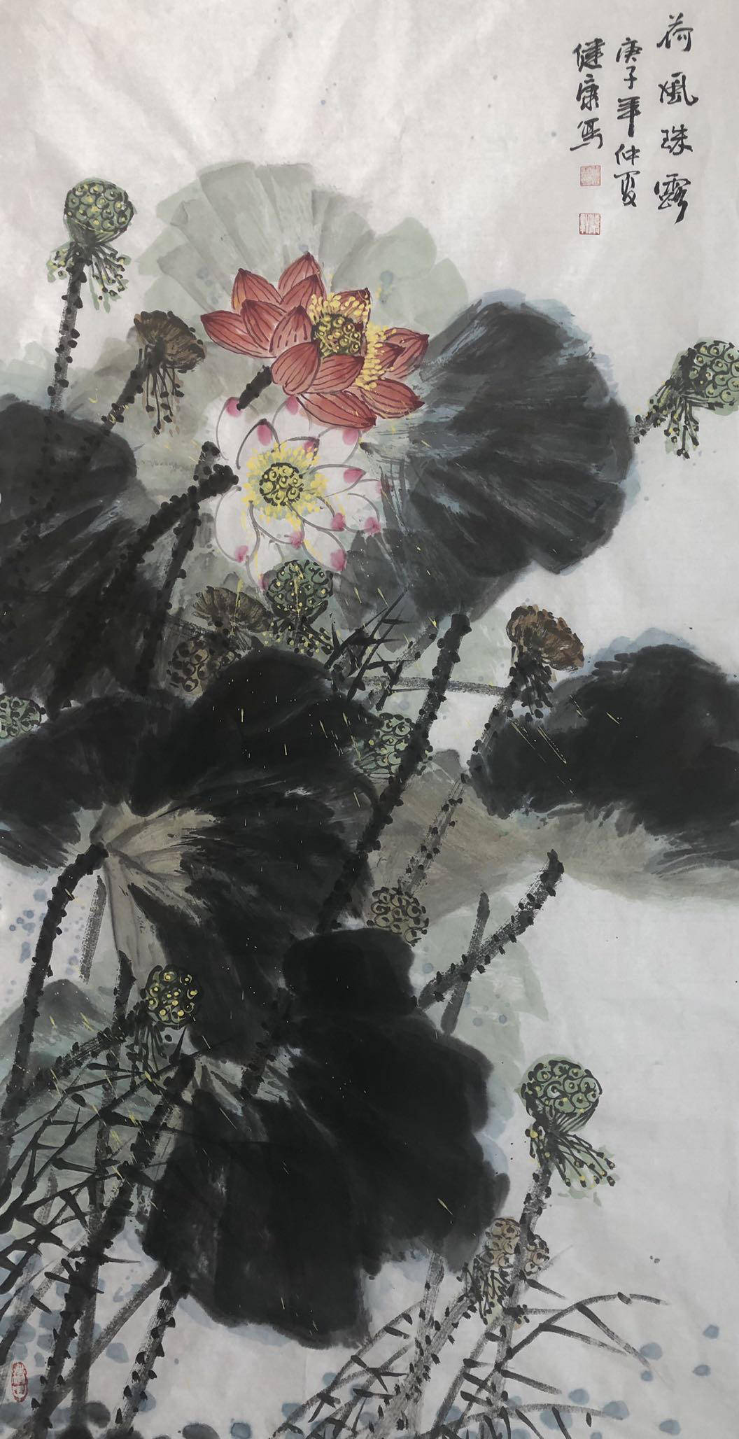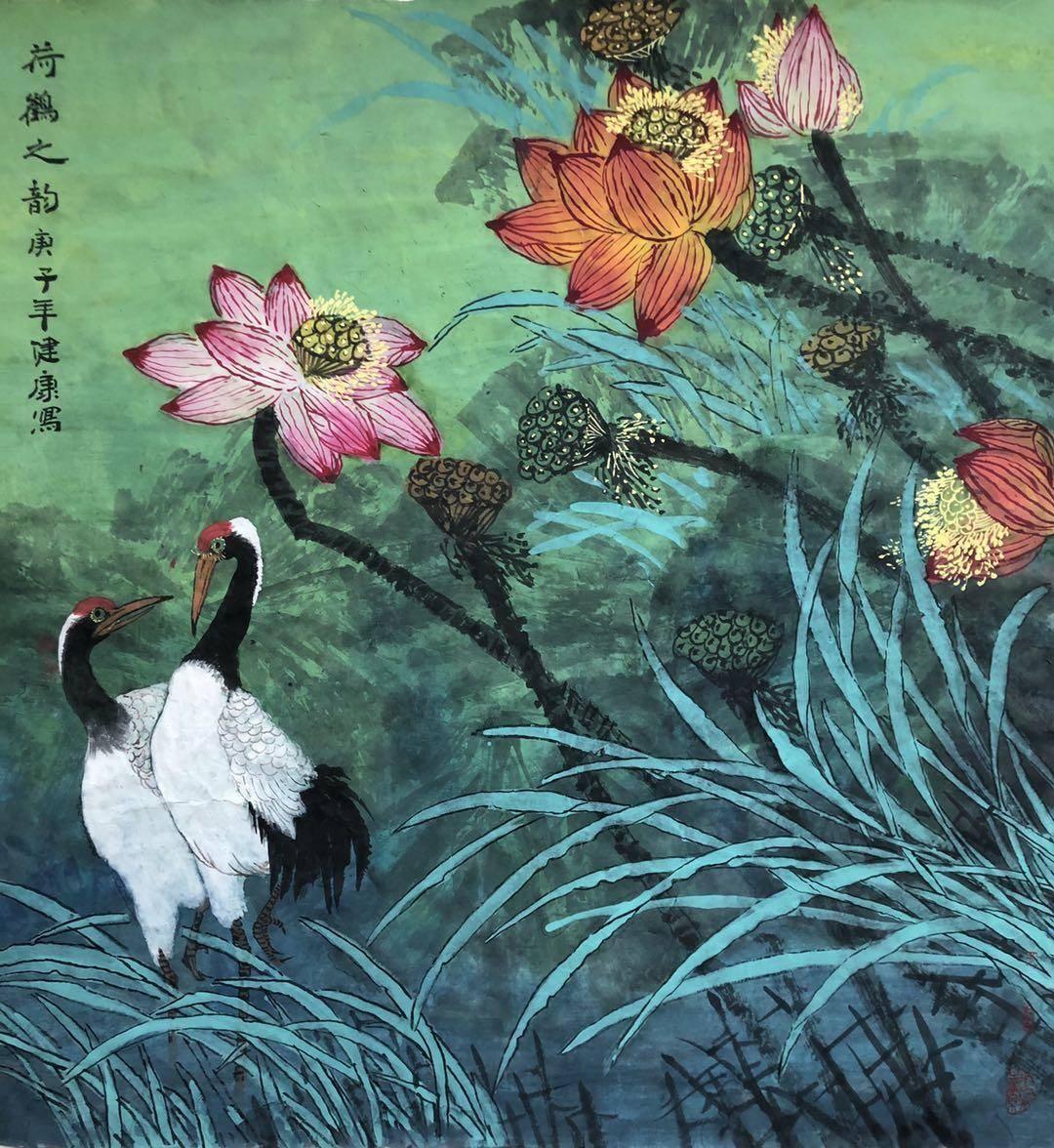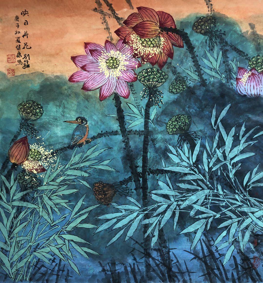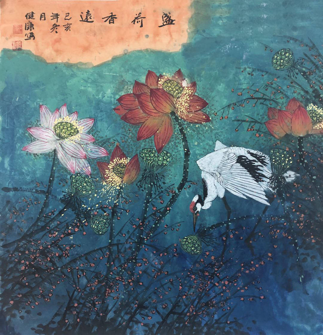 李健康,现为中国美术家协会会员、中国敤首书画艺术研究院院长、健康美术馆馆长、中国工艺美术协会会员、中国人民大学艺术学院高研班导师、中国沫若书画院艺委会主席、中国涉外经济学院客座教授、中华艺术家杂志社执行社长,国家一级美术师、山西运城盐湖书协、美协名誉主席。 2014年《绿色家园·百花写照》李健康书画全国巡回展(首站内蒙古呼市、第二站江苏无锡、第三站吉林长春、第四站福建东山、第五站江苏宜兴)取得圆满成功! 2015年作品《徽乡记忆》获“首届八大山人全国山水画作品展”优秀奖 中国美协主办 2015年作品《四君子》入选“高品洁性兰惠人生”中国美协主办 2015年作品《幽居在空谷》入选“纪念潘洁兹诞辰一百年全国中国画展”中国美协主办 2018年作品《秋风弄好音》入选“入蜀方知画意浓”全国美术作品展(中国画)中国美协主办 2018年作品《秋水长天》获“诗乡画城·潇洒桐庐”全国中国画作品展入会资格中国美协主办 2019年作品《徽乡记忆之月是故乡明》入选“山西省第十七届美术作品展”。 2019年作品《春暖鸭先知》参加山西省第五届工笔画展。 2019年作品《清风鸣翠》获“客都梅州.风眠故里”全国中国画(山水花鸟)作品展入会资格。{中国美协主办} 出版《李健康花鸟画作品集》、《中国名人堂 当代百名书画家系列—花鸟画家李健康》、《李健康扇面小品书法集》、《中国当代书画大家个案研究—李健康花鸟画作品集》等。 编者语—— 每到荷花盛开的季节,娇艳美丽的荷花,妩媚动人姿态,饱含韵味的她被无数文人墨客所赞颂,历代画家为之闲情寄写,执著不倦地为她写真传神。美好品格,更被人们当做是自身修养的品鉴。追捧荷花高贵品质的人络绎不绝,而李健康对荷花的追捧仍在继续, 他画的荷花独树一帜,神韵盎然。李健康画的荷花显得分外高洁清逸,不仅超凡脱俗、临风亭立的仙骨神韵给他以绝妙的美感享受,那出淤泥而不染、濯清涟而不妖的气节品性 。 作品赏析: 《金红开似镜》68x68cm