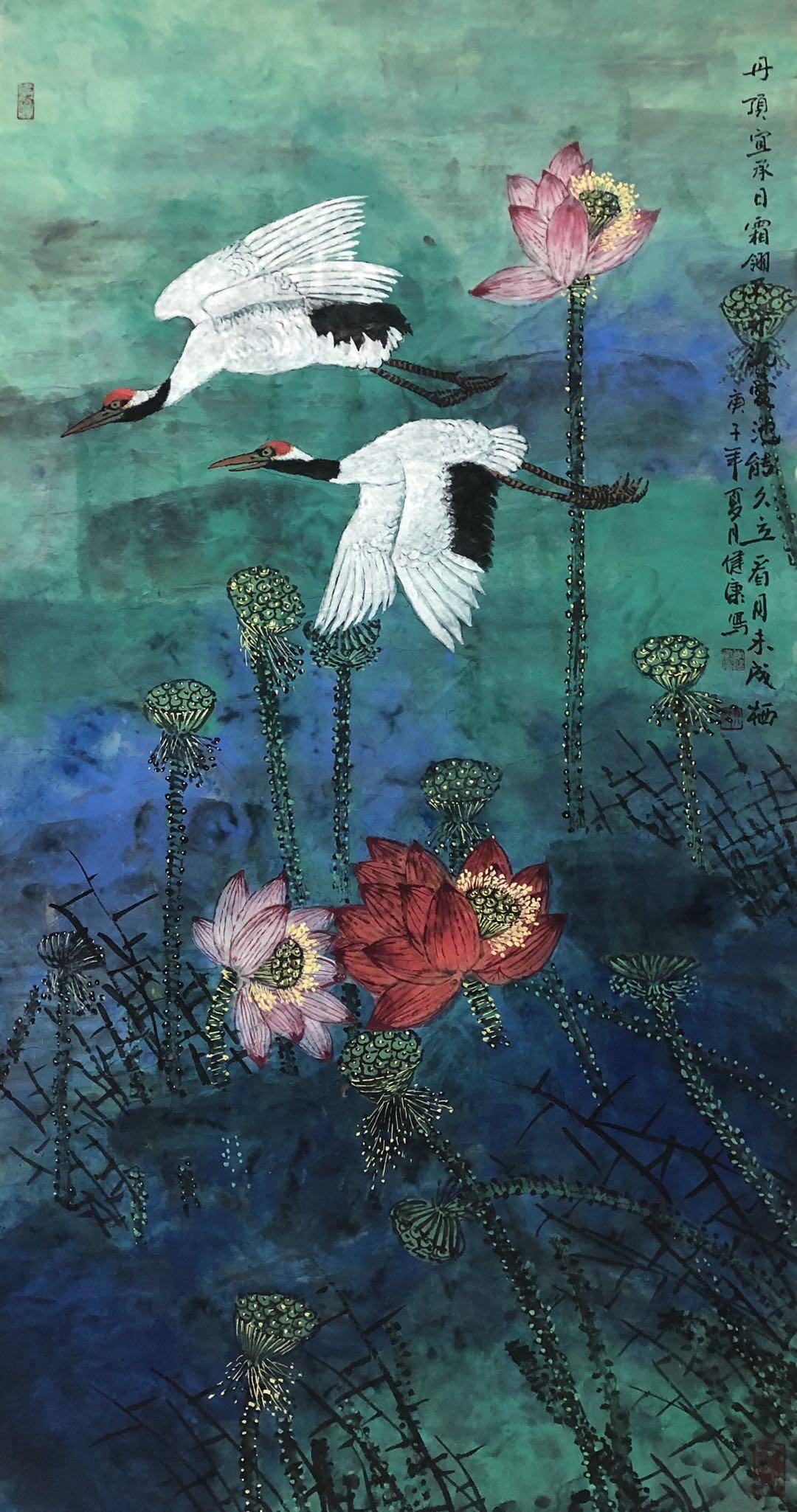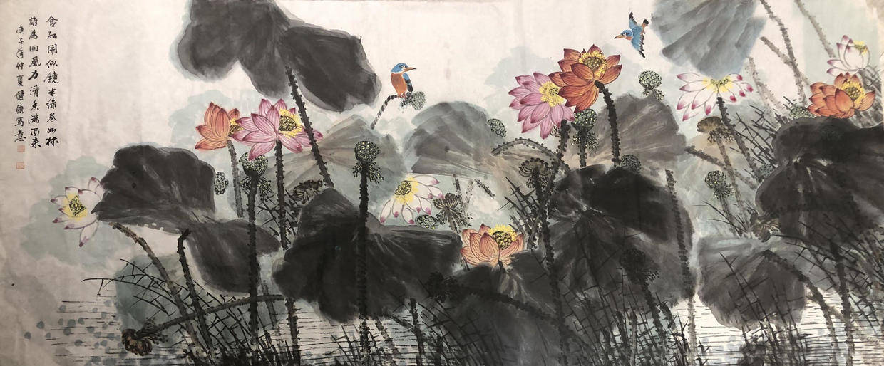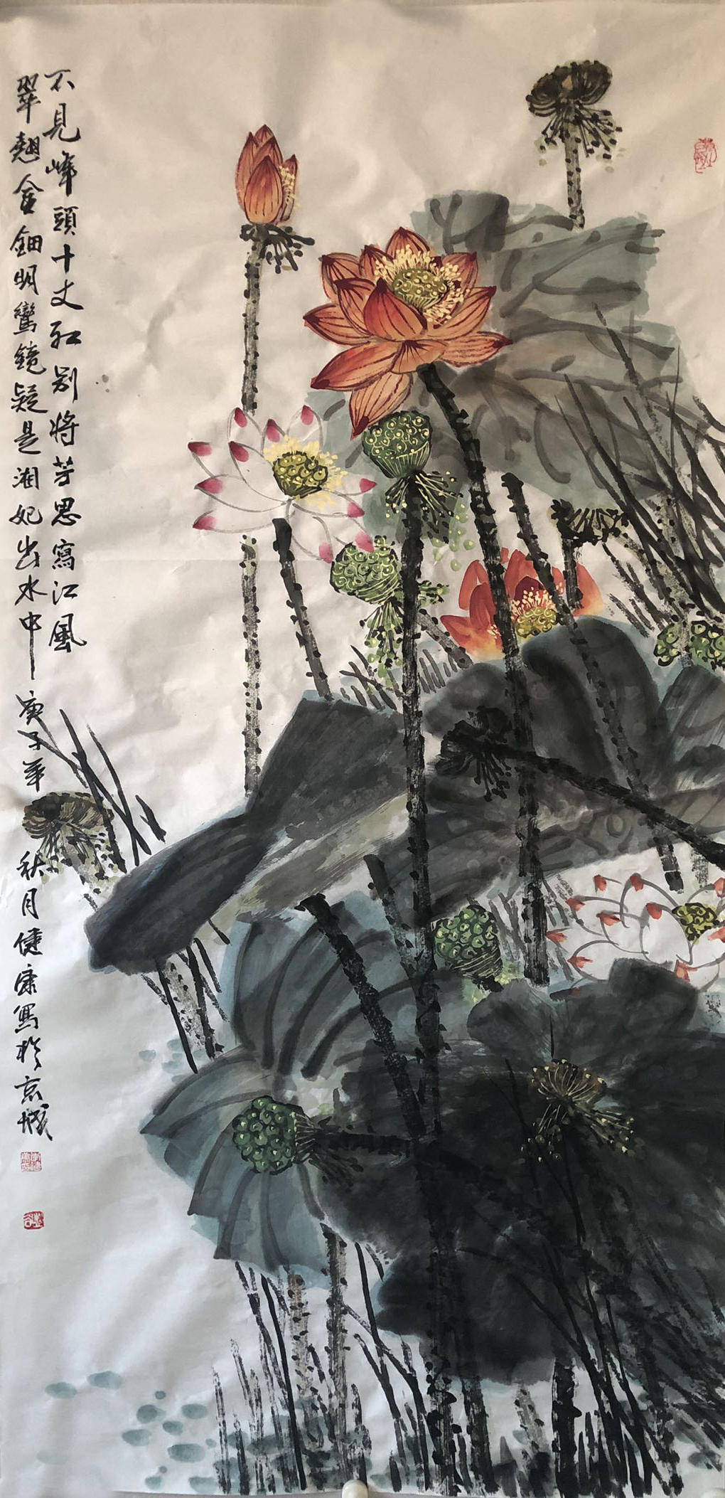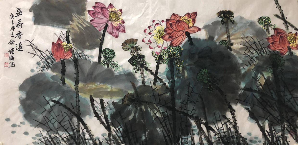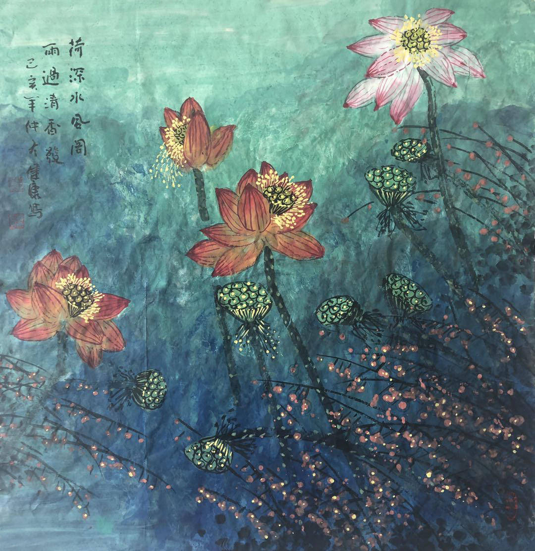 李健康,现为中国美术家协会会员、中国敤首书画艺术研究院院长、健康美术馆馆长、中国工艺美术协会会员、中国人民大学艺术学院高研班导师、中国沫若书画院艺委会主席、中国涉外经济学院客座教授、中华艺术家杂志社执行社长,国家一级美术师、山西运城盐湖书协、美协名誉主席。 2014年《绿色家园·百花写照》李健康书画全国巡回展(首站内蒙古呼市、第二站江苏无锡、第三站吉林长春、第四站福建东山、第五站江苏宜兴)取得圆满成功! 2015年作品《徽乡记忆》获“首届八大山人全国山水画作品展”优秀奖 中国美协主办 2015年作品《四君子》入选“高品洁性兰惠人生”中国美协主办 2015年作品《幽居在空谷》入选“纪念潘洁兹诞辰一百年全国中国画展”中国美协主办 2018年作品《秋风弄好音》入选“入蜀方知画意浓”全国美术作品展(中国画)中国美协主办 2018年作品《秋水长天》获“诗乡画城·潇洒桐庐”全国中国画作品展入会资格中国美协主办 2019年作品《徽乡记忆之月是故乡明》入选“山西省第十七届美术作品展”。 2019年作品《春暖鸭先知》参加山西省第五届工笔画展。 2019年作品《清风鸣翠》获“客都梅州.风眠故里”全国中国画(山水花鸟)作品展入会资格。{中国美协主办} 出版《李健康花鸟画作品集》、《中国名人堂 当代百名书画家系列—花鸟画家李健康》、《李健康扇面小品书法集》、《中国当代书画大家个案研究—李健康花鸟画作品集》等。 编者语—— 每到荷花盛开的季节,娇艳美丽的荷花,妩媚动人姿态,饱含韵味的她被无数文人墨客所赞颂,历代画家为之闲情寄写,执著不倦地为她写真传神。美好品格,更被人们当做是自身修养的品鉴。追捧荷花高贵品质的人络绎不绝,而李健康对荷花的追捧仍在继续, 他画的荷花独树一帜,神韵盎然。李健康画的荷花显得分外高洁清逸,不仅超凡脱俗、临风亭立的仙骨神韵给他以绝妙的美感享受,那出淤泥而不染、濯清涟而不妖的气节品性 。 作品赏析: 《金红开似镜》68x68cm