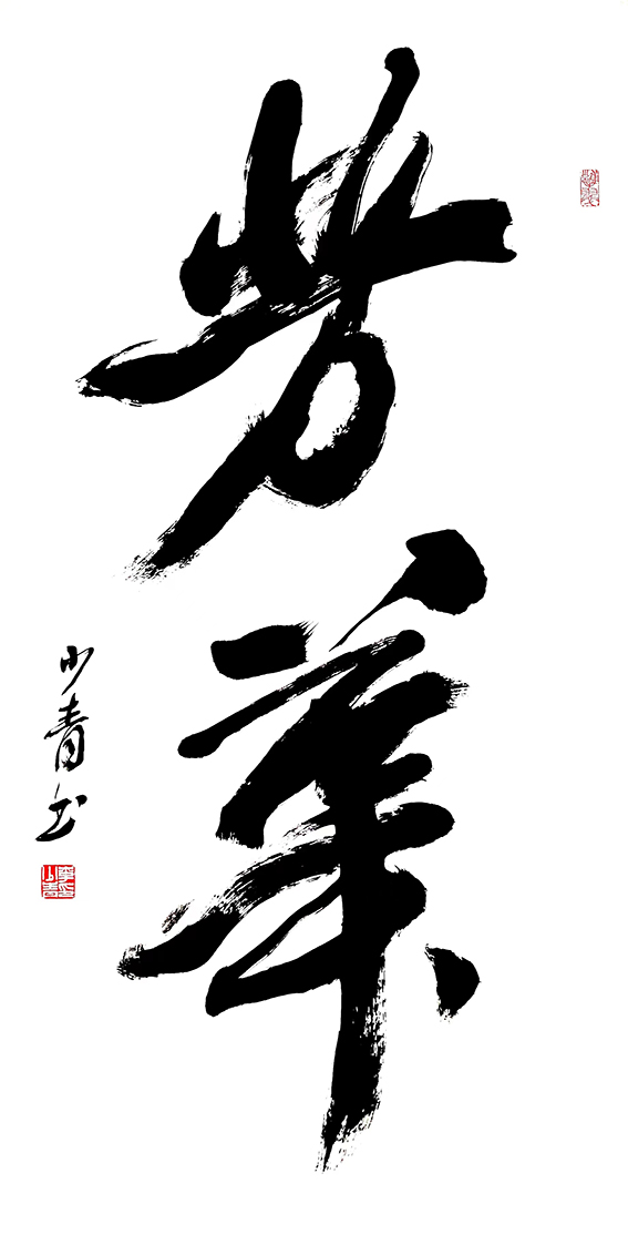 在当代书家中,少青的才情和功底不容小觑。少青之书,融欧柳颜赵、苏黄米蔡为一炉,风格清隽飘逸中寓刚劲挺拔,追姿韵,求变幻,下笔提沉有力,既纵横不拘,超逸神飞,又朴拙率性,豁爽洞达。其书品风骨骏爽,气韵沉雄,华滋朴厚,重锤夯凿。他以汉唐精神融入魏晋风韵,师古人,师造化,师我心,遍采儒墨之善,尽撮名法之要,既传承又展拓,大开大合,格高意远,笔墨元气淋漓,字体气宇轩昂,书采飞扬仙逸,在把传统推向现代的转换之中独有建树,在传承中展现文化底蕴和时代风貌。初观其书,犹如一位武功高手,屏气凝神,隐张扬之动作,藏炫技之招法,然细观其书,古朴中怀了柔婉,厚拙中含了灵动,放纵中收了锋锐,苍劲中透了潇洒,看久了,竟有武功、神性和禅意氤氲开来。少青书法的表现手法在于他对艺术感悟的深度,以及他对书法以外的人世万象的理解和诠释。他说:心正则人正,人正则艺正,只有艺正了,才能走进历史,传承历史。我相信,以其勤奋加悟性的整体素养,中国书坛定有专属于少青的艺术坐标和金色殿堂。
