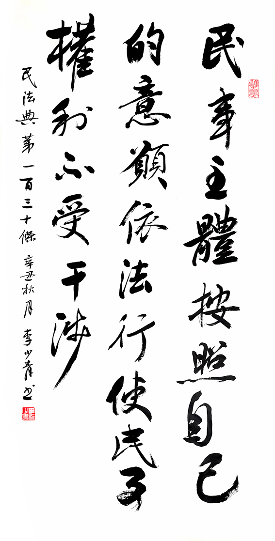 李先生磨砺书法,非常重视线条的塑造效果,诸书皆成,博涉多优,尤其以洒脱自如的行草作品而称闻书坛!其笔墨精确表现塑造线条的速度和力度,拥有书法用笔千古不易的法度玄机。大笔一挥,作出长线条,如虬龙蜿蜒,亦如鸾凤徘徊。速度快时如惊雷驰电,速度慢下来时则如落花飞雪!可以在一划之间变起伏于锋杪,也可以在一点之内殊衄挫于毫芒!执笔在于手,运笔在于心,心与笔合,情与墨融,把书法写得心手双畅,智巧兼优。站在这样的书法作品面前仰观,必然有感叹:书法之渊妙,代不绝人!贤才书风,飞逸于眼前!