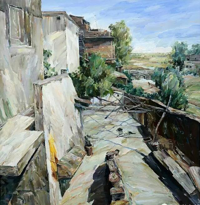 丁伟对油画艺术的挚爱很纯粹。他走到哪里,创作的素材和灵感就在哪里。2018年的春节,丁伟满怀乡愁回到从小生活的家乡南阳,那里的老景观,那时的少年心,窄巷子的人家,买卖人的吆喝,那些石板路,那种过往情,离开家乡20年,家乡生活的细节,都在触动他敏感的神经,激发他创作的灵感。那口老井,那棵古树;那条老街,那个小巷;那座小桥,那道流水;那处院落,那扇木门,儿时的记忆犹如电影屏幕闪过脑海,让丁伟心潮难平。一幅幅活灵活现的画面,不,那是一个个乡愁的文化符号,使他陷入了创作的痴迷。没有顾忌亲朋好友的举杯欢聚,谢绝一个个应酬,在儿时玩耍过的地方支起画布,一头扎进乡愁印记的描绘中。他不是一时迷醉,但却是不可自拔。绘画让他找到了自己,触摸到了灵魂,仿佛自己是一团阳光,是一片春色,自己的世界充满了温暖,自己的生活充满了希望。