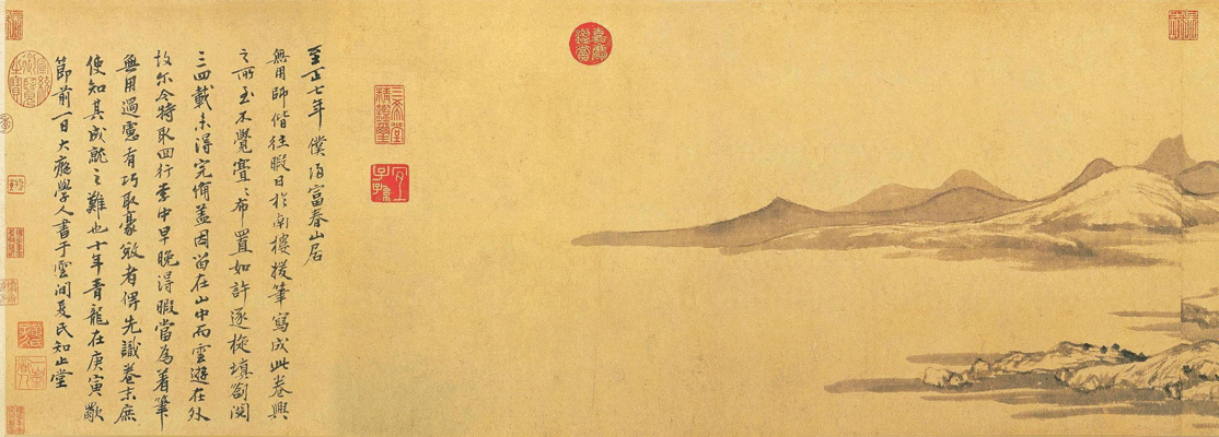 此预言不幸一语成谶。七百年里,这幅画牵动了太多人的悲欢。黄公望在公元1350年于画末落款题跋,“暇日于南楼援笔……兴之所至,无用过虑,有巧取豪夺者。俾先识卷末,庶使知其成就之难也……”落款那一年是庚寅年,从此有关此图的故事,不断于不同的庚寅年出现转折;而且凡想巧取或豪夺者,正如大痴预言,终难究其全貌矣。