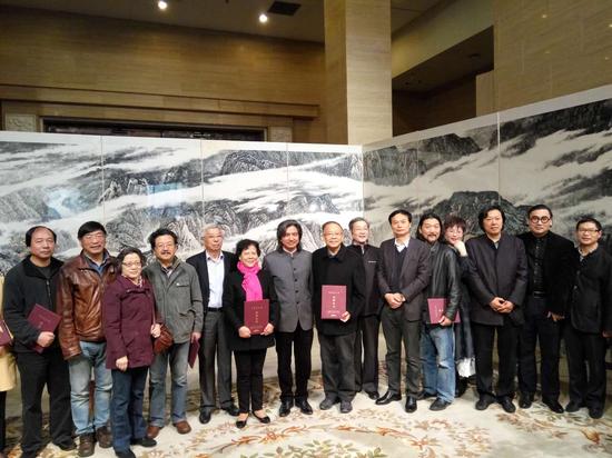 捐赠仪式嘉宾合影 中国书画导航网消息(通讯员:陆地)2016年10月24日上午,巨幅通景山水画《三峡史诗》捐赠仪式在中国美术馆举行。《三峡史诗》巨幅通景山水画的创作活动,是我国著名山水画家亚明先生生前所倡导,以江苏画家秦剑铭为发起人,会同长江沿岸六省市的其他八位画家,施江城、徐建明、朱修...[详细内容]