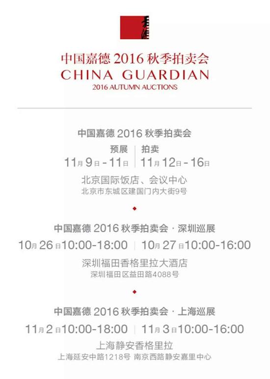 中国书画导航网消息(通讯员:陆地)中国嘉德2016秋拍全国巡展10月下旬正式启动,将陆续赴深圳、上海等地巡展。中国书画、中国二十世纪及当代艺术、陶瓷、工艺品、古籍善本、邮品钱币等门类的秋拍拍品联袂展出。 [深圳站] 深圳作为改革开放的前沿城市,因其毗邻港澳的地理优势,在2000年开始逐渐成为...[详细内容]
