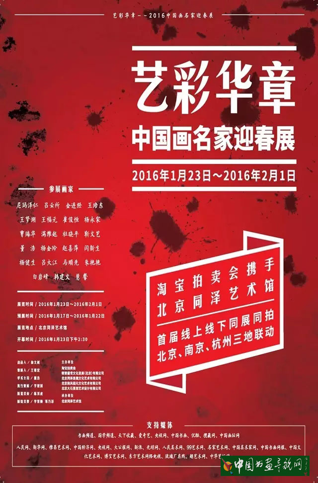 中国书画导航网(主编陆永生)北京消息,艺彩华章——2016中国画名家迎春展将于2016年1月23日开幕。 开幕时间 2016年1月23日 下午2:30 展览地点 北京同泽艺术馆 主办单位 阿里巴巴集团淘宝拍卖会 朝营盛世文化发展(北京)有限公司 北京同泽景园文化艺术有限公司 北京和...[详细内容]