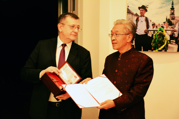 在斯洛伐克大使馆的晚宴上,弗兰季谢克·德霍波切克大使隆重地向王金昌颁发了大使荣誉奖杯和荣誉证书。德霍波切克大使在颁奖仪式上讲到:“尊敬的王金昌阁下,非常荣幸为你颁发此项荣誉奖,对您在中斯文化交流合作及中斯两国人民民间交往领域所作...[详细内容]