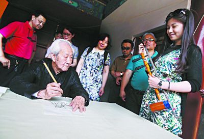 昨天,90岁高龄的李滨声老先生现场为一名传统文化爱好者绘制肖像漫画。本报记者 方非摄 本报讯 (通讯员 曹蕾)婴儿降生要洗三、卖东西的扎爱国绳、入冬穿蒜瓣儿、穷人家孩子打蜜供……昨天这些与老北京有关的历史记忆,通过绘画在西城区烟袋斜街广福观复生了。众多上了年纪的观众,在这场“寻找北...[详细内容]