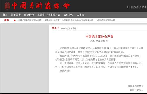 中国美术家协会官网截图中新网4月9日电9日,中国美术家协会在其官网上发布声明,称协会主席刘大为与毕福剑素不相识,并未参加过毕福剑的任何饭局。声明全文如下:中国美术家协会声明近日网曝“毕福剑唱评智取威虎山并辱骂毛主席”事件,有人刻意将我会主席刘大为着军装的照片粘贴其中,并加上“刘大为...[详细内容]