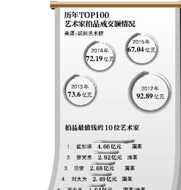 艺术品成交额连降三年 胡润:与反腐有关经历了2014年艺术市场的反弹失败后,2015年胡润艺术榜在世艺术家TOP100的上榜艺术家拍品成交额亦普遍下滑,且上榜艺术家总成交额呈现出连续3年下滑的黯淡景象。3月18日,胡润研究院发布的《2015胡润艺术榜》显示,今年100位上榜艺术家的总成交额为67亿元,相比20...[详细内容]
