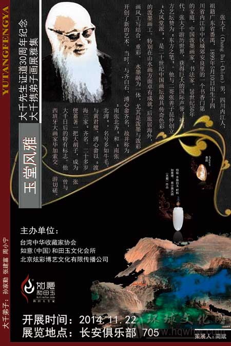 “氤氲如玉”——大千先生证道三十年纪念及弟子画展、玉展将于2014年11月22日下午15:00在北京长安俱乐部隆重开幕。在上个世纪的中国画家中,张大千无疑是其中的佼佼者。先生丰富而多彩的艺术世界以书画用力最深,精擅山水、花卉、人物。在书法、文学、理论、生活等多方面,都学而不厌,老而不辍。其画...[详细内容]