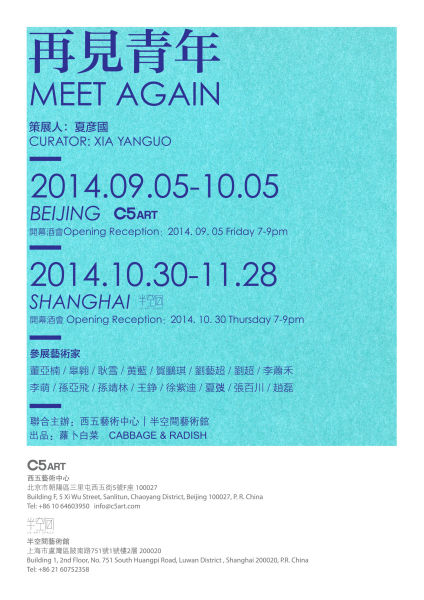 展览海报 再见青年 展览时间:2014.09.05-10.05 开幕聚会:2014.09.05 19:00-21:00 展览场所:西五艺术中心 北京市朝阳区三里屯西五街五号院F座 参展艺术家:董亚楠、皋翱、耿雪、贺鹏琪、黄蓝、李萌、李萧禾、刘超、刘艺超、孙靖林、孙亚飞、王铮、夏弢、徐紫迪、赵磊、张百川 ...[详细内容]
