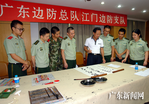 边防官兵在观看书法家创作书法家向边防官兵赠送书法作品 广东新闻网江门9月4日电(李健群)江门市书法家协会主席黄瑞剑一行5人3日专程来到广东公安边防总队江门市边防支队机关,与官兵们进行了一次“翰墨飘香进军营”联谊活动,书画家们精心创作了60多幅书画作品赠送部队。 活动中,书画家们以一幅...[详细内容]