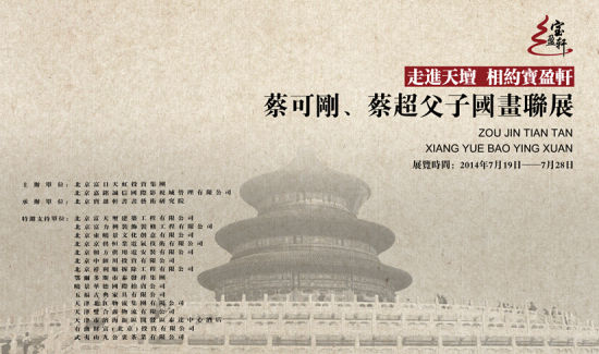 展览海报 2014年7月19日,由北京富日天虹投资集团、北京嘉铭诚信国际影视城管理有限公司主办,北京宝盈轩书画艺术研究院承办的“走进天坛相约宝盈轩”-蔡可刚、蔡超父子国画联展,在位于北京天坛公园东门内的北京宝盈轩书画艺术研究院隆重开幕。 蔡可刚,1940年生于山东省微山县,毕业于山东曲...[详细内容]