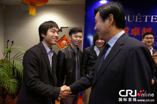 中国驻法大使翟隽(右一)与中国青年油画家交流 18日,由中法学院派青年艺术家共同参与的“追求卓越—2014中法青年油画家艺术交流展”在巴黎中国文化中心隆重开幕。中国驻法大使翟隽、巴黎中国文化中心主任殷福、法国艺术家协会会长马丁娜·德拉乐芙、中央美术学院油画系教授胡建成等中法嘉宾和友人...[详细内容]