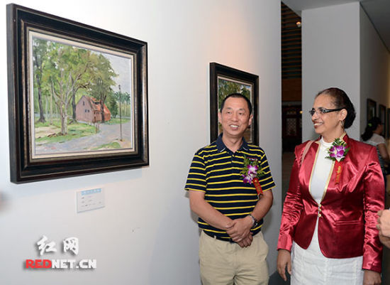 (蔡国胜(左)陪同苏里南驻华使馆代办桑德拉女士参观在北京举行的“魅丽苏里南——蔡国胜、安滨油画、水彩写生展”。) 红网长沙9月9日讯(记者 明健飞)9月8日,历时一周的“魅丽苏里南——蔡国胜、安滨油画、水彩写生展”在北京清华大学美术馆降下帷幕。由苏里南共和国驻华使馆、中国驻苏里南大...[详细内容]