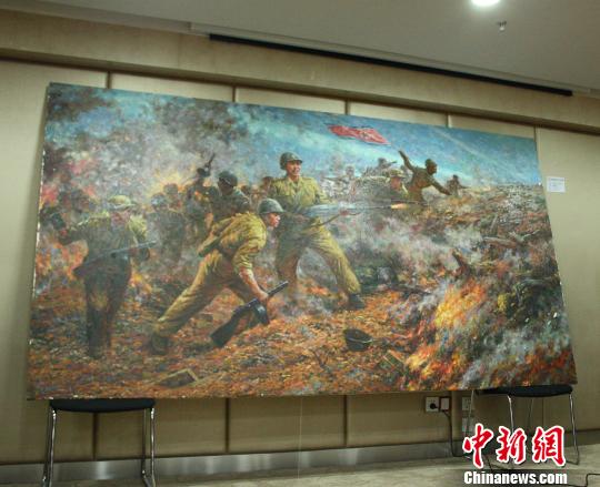 图为朝鲜艺术家提供的战争题材油画作品。 吴佳蔚 摄 中新网杭州9月10日电(见习记者 吴佳蔚)10日,来自朝鲜多名国家级艺术家的70多副油画大作及2副刺绣作品在浙江展出。记者自现场获悉,作品多以朝鲜本国的风土人情为内容,同时也出现了该国艺术创作有史以来罕见的战争题材作品。 据介绍,本次...[详细内容]