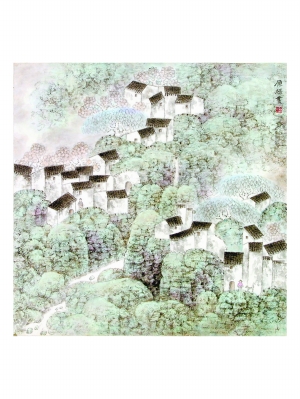 《圆陀山》 圆陀山的山石多为圆形和椭圆形,在自然的景观中,不但石头如此,树冠也大多如此。画家在写生中把这些圆形树冠也画成了山石,又经过艺术的“酿化”、积累和提纯,山石树木等都趋向于“圆”的意象,在有意识的夸张强化下,最终表现出了画家心中的山水。画面左侧,是数幢黛瓦粉墙的民居...[详细内容]