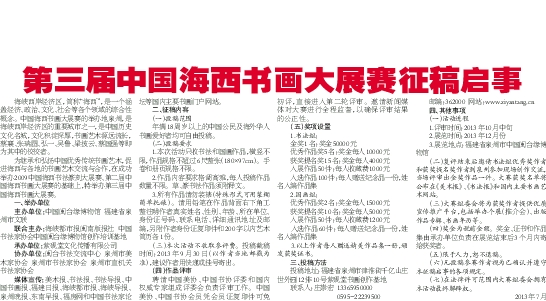 海峡西岸经济区,简称“海西”,是一个涵盖经济、政治、文化、社会等各个领域的综合性概念。中国海西书画大展赛的举办地泉州,是海峡西岸经济区的重要城市之一,是中国历史文化名城,文化积淀深厚,书画艺术源远流长,蔡襄、张瑞图、弘一、吴鲁、梁披云、蔡国强等即为其中的佼佼者。 为继承和弘...[详细内容]