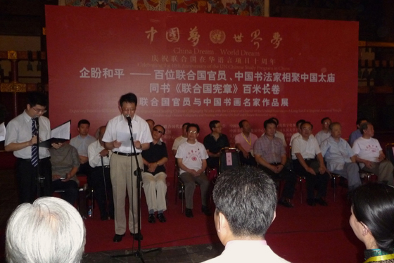 何勇组长致辞 一超摄人民美术网讯 (特约记者彭一超)为庆祝联合国在华语言项目十周年。2013年7月14日下午四时,由联合国中文组主办,北兰亭艺术中心、人民画报社承办的中国梦、世界梦——“企盼和平”百位联合国官员、中国书法家相聚北京太庙同书《联合国宪章》百米长卷暨联合国官员与中国书画名家作...[详细内容]