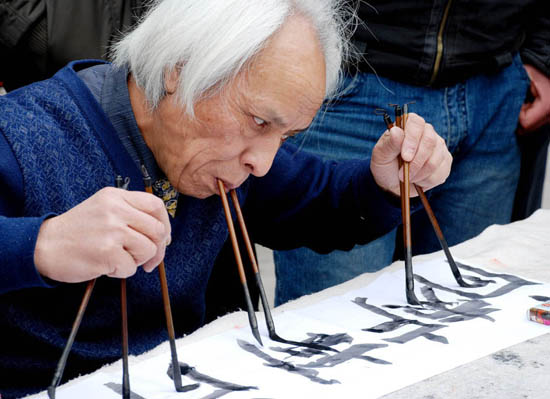 近日,湖南书法家周命迪在山东枣庄表演“八管齐书”。周老先生近些年练就运用全身各部位写字的绝技书法,可以用全身各个部位写字。 周命迪,湖南省东安县人。现为中国书画家联谊会会员,三亚旅游学院客座教授,泰国大同社中华画院副院长。自幼喜好书法,潜心翰磨数十载,能写多种字体。作品苍劲有力...[详细内容]