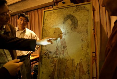 图片资料 日前,一幅流落海外多年的国宝级唐仕女壁画终于回归祖国。该壁画由宁波民间藏家夏孤帆和胡海平先生携手以1300万元从日本拍卖行拍回。 这幅壁画高106厘米,宽54厘米,绘于白灰泥质墙壁之上。画面主体为一体态丰满的站立仕女,头梳高髻、身着长裙,肩部帔帛缠绕,双手持一“筌蹄”(一种...[详细内容]