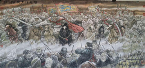 这是中国历史上乃至世界战争史上以少胜多的著名战役。大画通篇234平尺,只用赭和黑色去诠释那宏大的历史场景。东晋时,秦王苻坚亲率八十万大军,去攻打晋国。晋国大将谢石、谢玄领八万兵马迎战。大画的最右端是苻坚手握马鞭指...[详细内容]