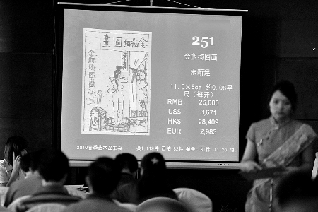《金瓶梅图画》册页遭到数人竞价追捧,最终以4.5万元成交 商报记者陈薇/文王棣/图 股市震荡,楼市微妙,这让艺术品拍卖会一时间人声鼎沸。河南某家拍卖行在昨日举行了艺术品拍卖会。在会上,一些玩家情愿站一天等待拍自己喜欢的东西。 在北京,拍卖会一天平均有十几场,密集程度堪比非典...[详细内容]