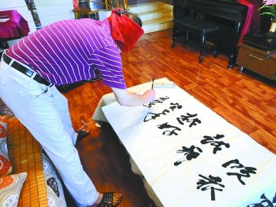 (图)退休教师蒙眼练书法 七八分钟内写10余字祝福语...
